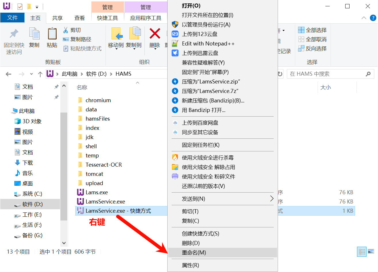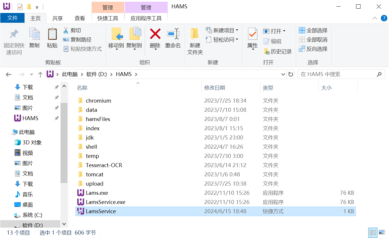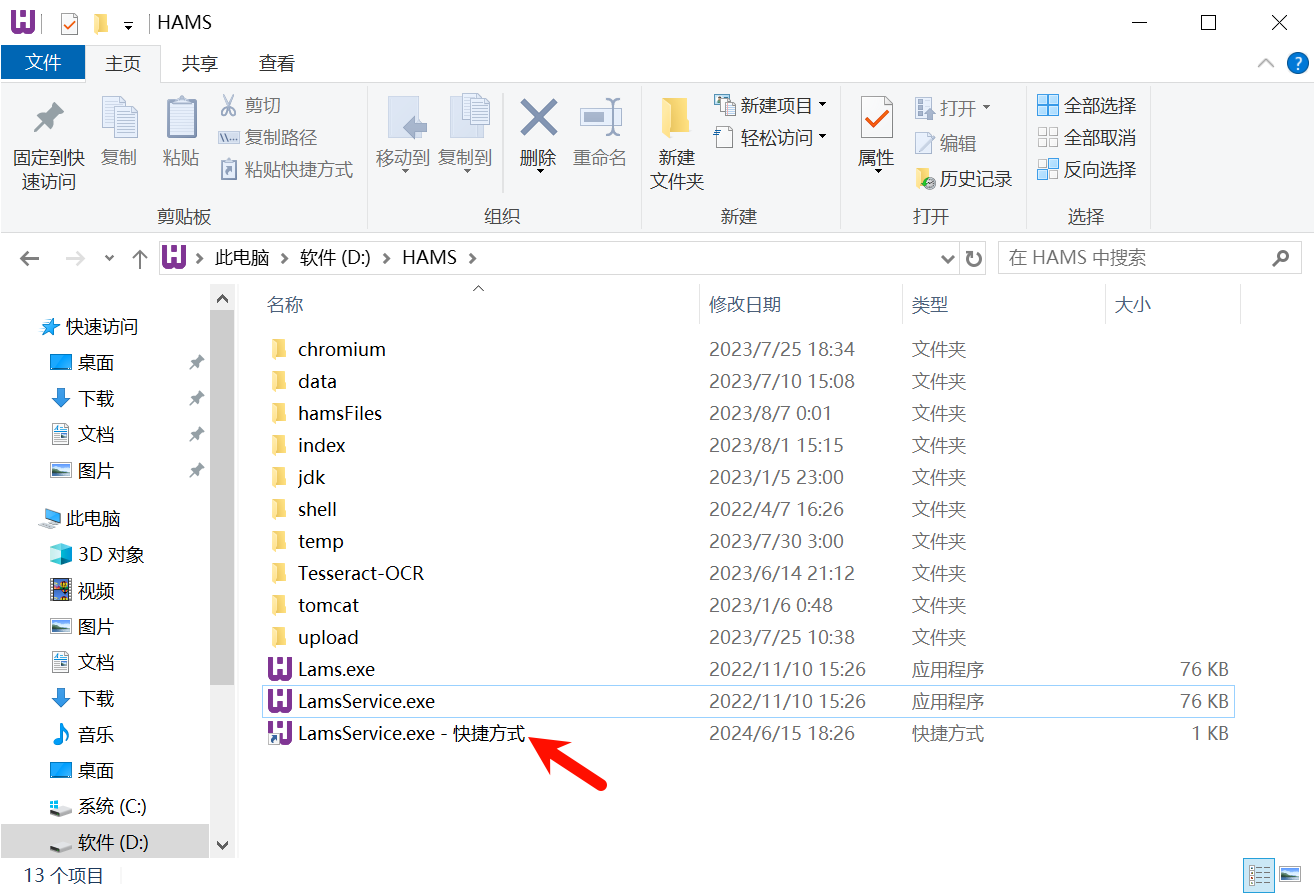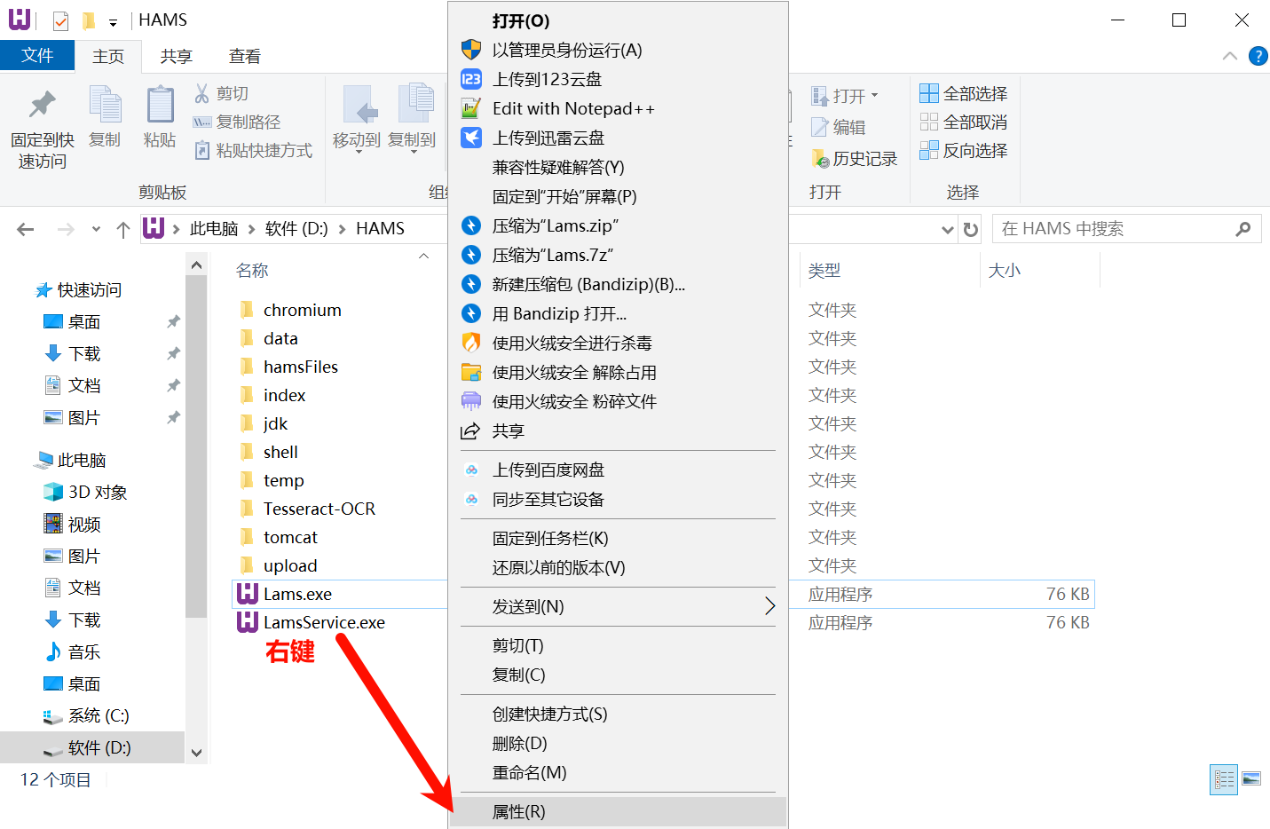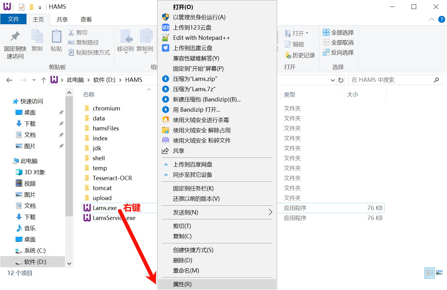 **原因分析:** 电脑杀毒软件或其他安全防护软件拦截了HAMS后台服务自动启动进程。 **解决方法:** 1.打开HAMS安装目录(==D:/HAMS==),分别找到“==Lams.exe==”和“==LamsService.exe==”,右键,打开“==兼容性==”,勾选“==以管理员身份运行此程序==”,依次点击“应用”-“确定”。如下图所示:     2.右键“==LamsService.exe==”,创建快捷方式,并重命名。如下图所示:     3.按下“==WIN+R==”快捷键,输入“==shell\:startup==”,回车,将“==LamsService==”快捷方式剪切并粘贴进去。如下图所示:     4.重启电脑,等待1-5分钟(启动时间视电脑配置而定,建议内存不小于4G),打开桌面“==HAMS数字档案管理平台==”快捷方式,测试是否正常进入系统。   > 如上述问题仍无法解决,请与技术人员联系(服务热线:[15002785136](tel:15002785136 "15002785136"))。