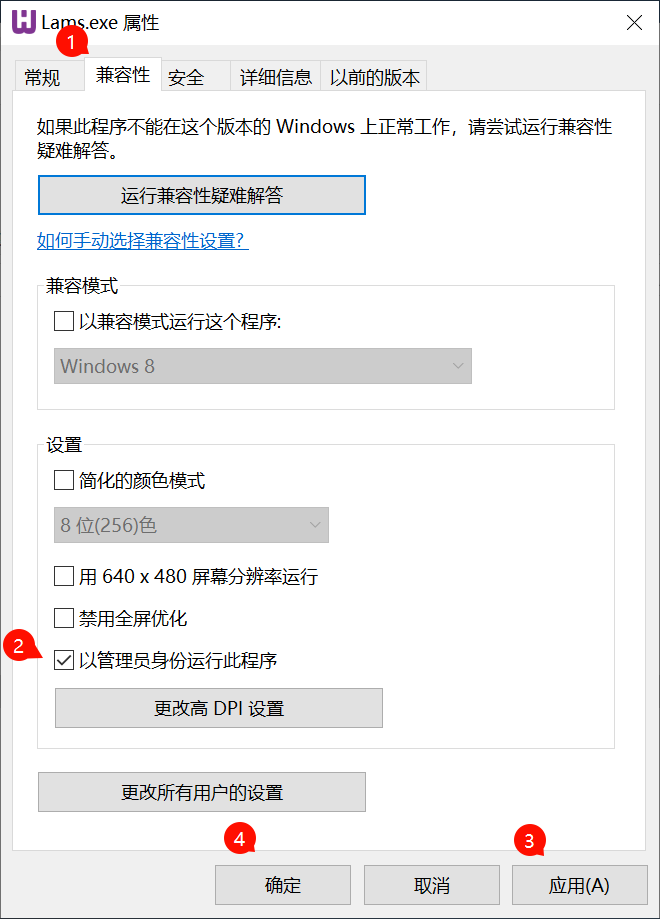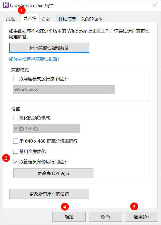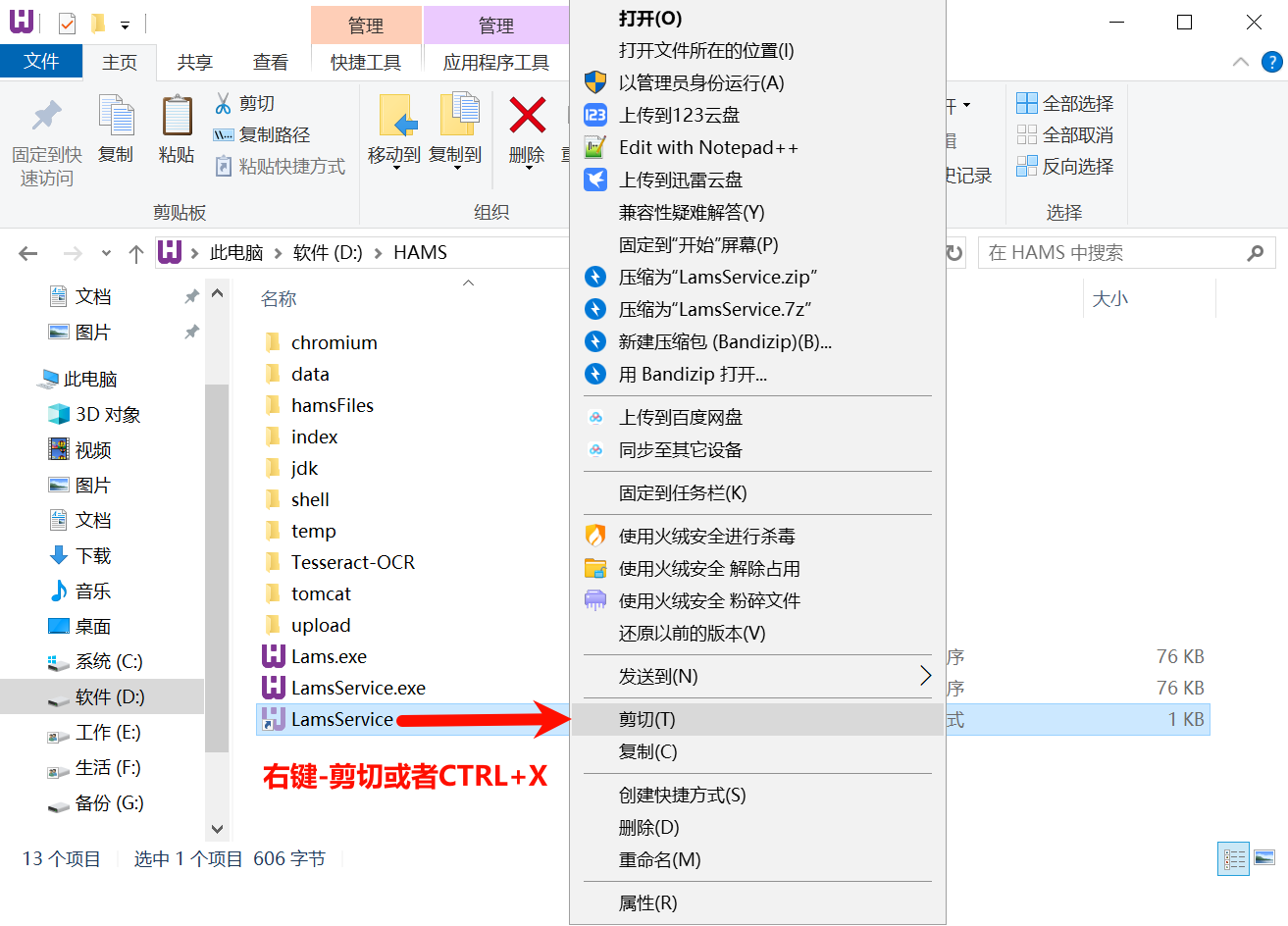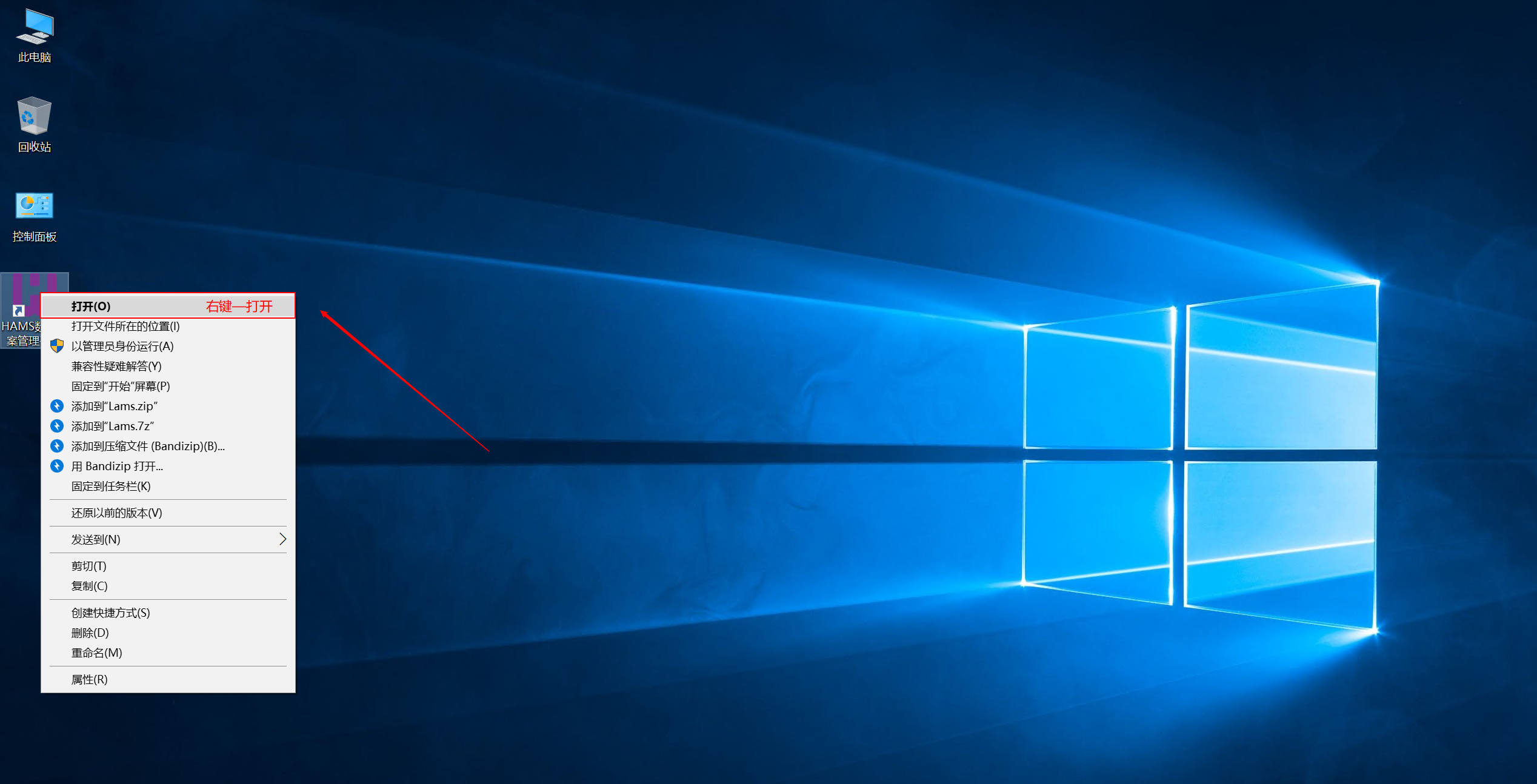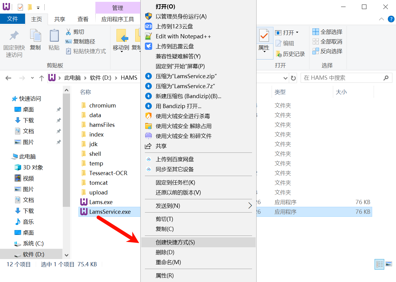 **原因分析:** 电脑杀毒软件或其他安全防护软件拦截了HAMS后台服务自动启动进程。 **解决方法:** 1.打开HAMS安装目录(==D:/HAMS==),分别找到“==Lams.exe==”和“==LamsService.exe==”,右键,打开“==兼容性==”,勾选“==以管理员身份运行此程序==”,依次点击“应用”-“确定”。如下图所示:     2.右键“==LamsService.exe==”,创建快捷方式,并重命名。如下图所示:     3.按下“==WIN+R==”快捷键,输入“==shell\:startup==”,回车,将“==LamsService==”快捷方式剪切并粘贴进去。如下图所示:     4.重启电脑,等待1-5分钟(启动时间视电脑配置而定,建议内存不小于4G),打开桌面“==HAMS数字档案管理平台==”快捷方式,测试是否正常进入系统。   > 如上述问题仍无法解决,请与技术人员联系(服务热线:[15002785136](tel:15002785136 "15002785136"))。