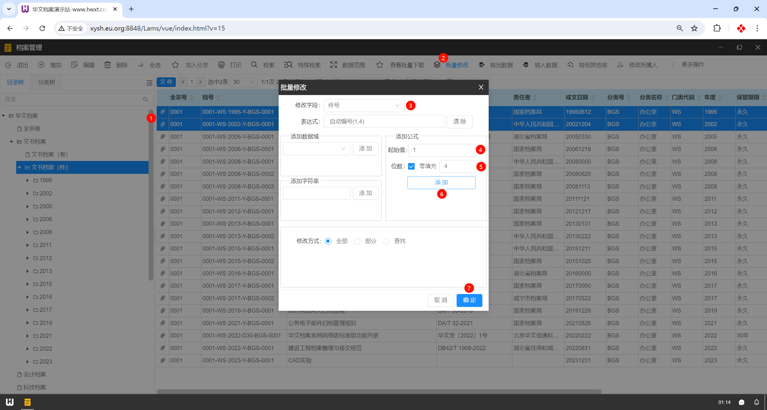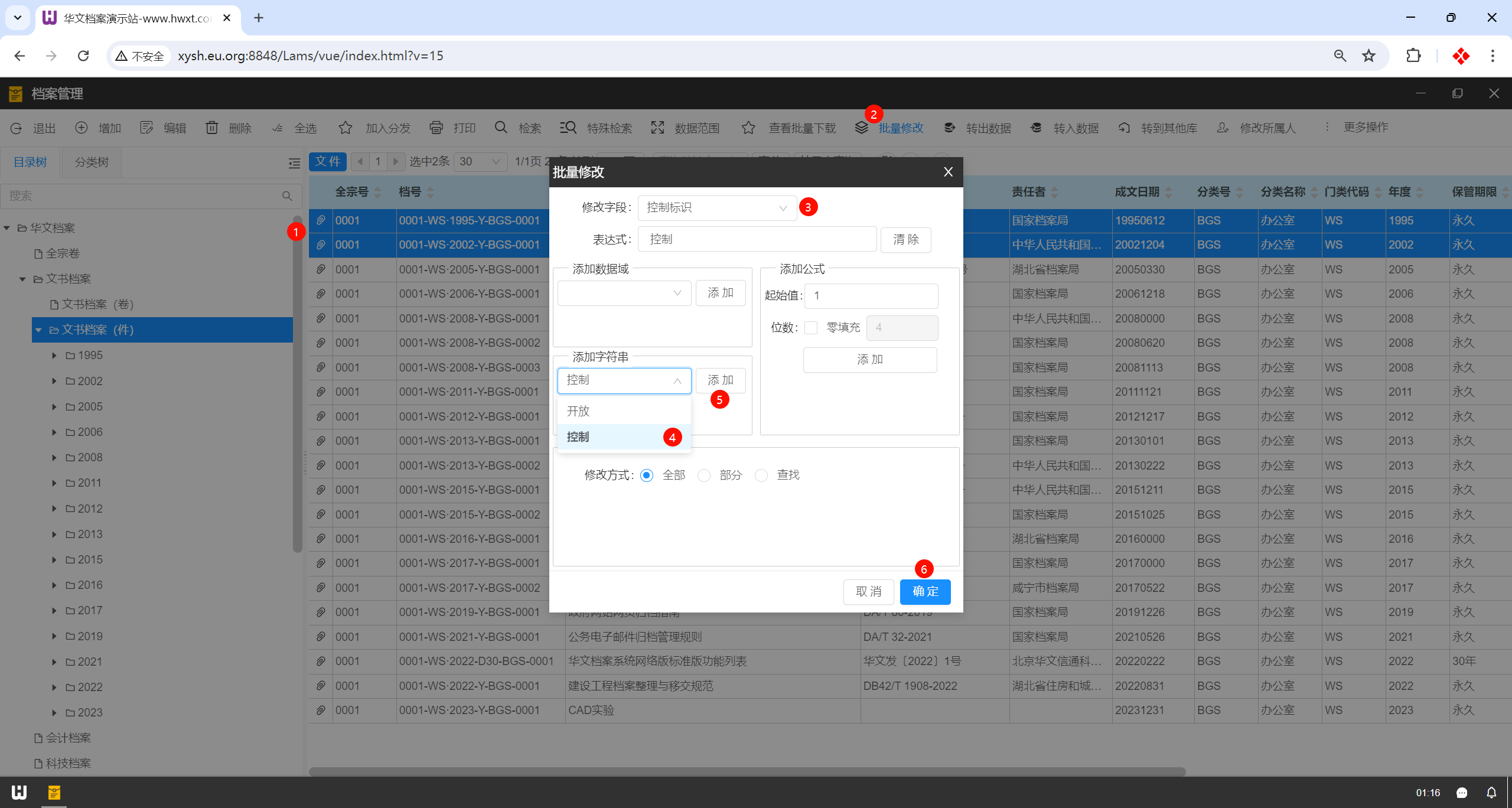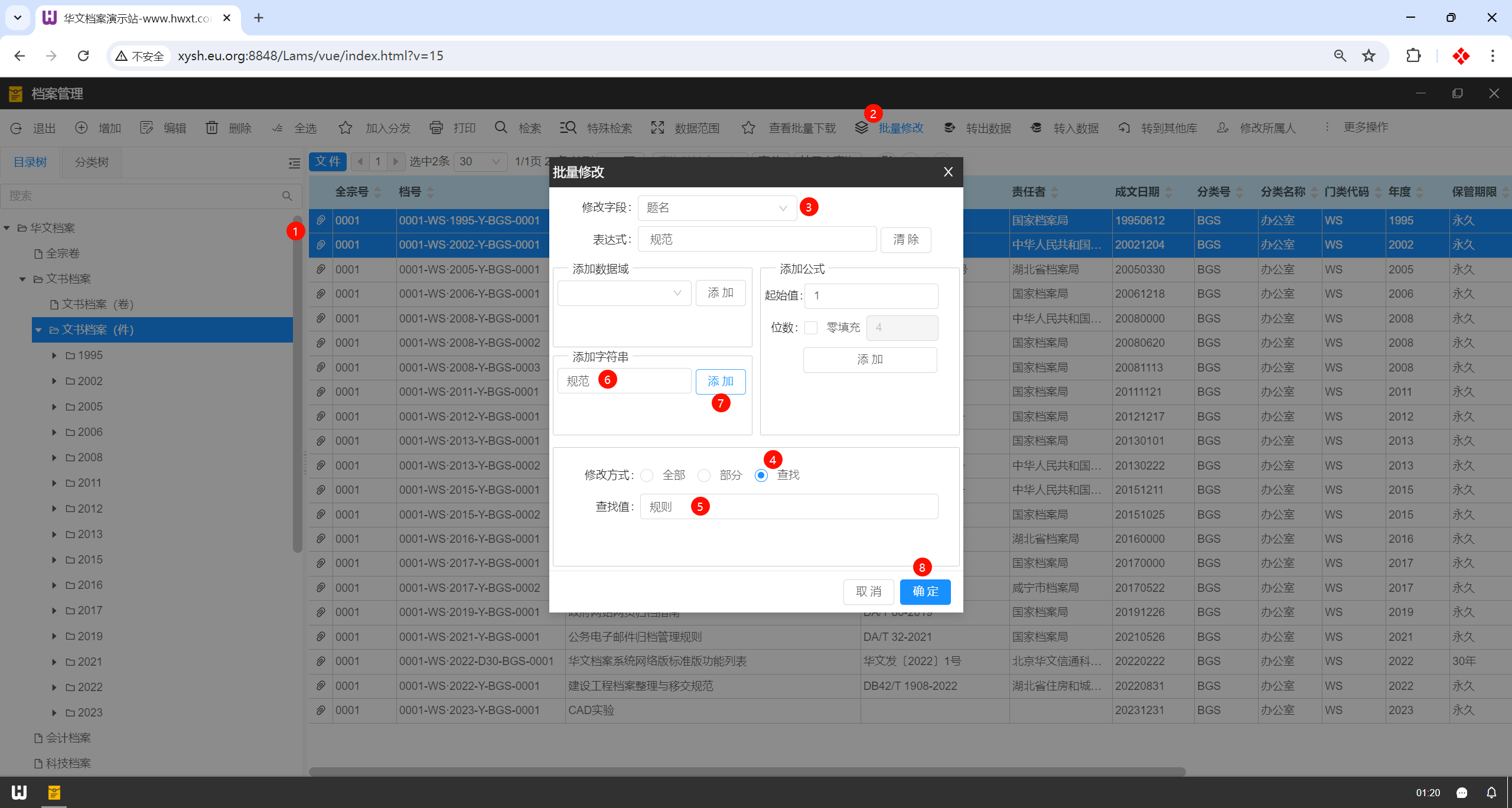 1.登录进入系统后,点击系统桌面“==档案管理==”图标。如下图所示:  2.以“文书档案(件)”为例,选中(==可使用Ctrl或Shift键配合鼠标进行点选或多选==)任意两条或两条以上条目(==建议首次选择两条测试==),点击“批量修改”,在弹出窗口中选择“==修改字段==”、“==数据域==”,单击“添加”、“确认”(本案例是将“分类名称”批量赋值给“分类号”,即“分类名称”=“分类号”)。如下图所示:  3.以“文书档案(件)”为例,选中(==可使用Ctrl或Shift键配合鼠标进行点选或多选==)任意两条或两条以上条目(==建议首次选择两条测试==),点击“批量修改”,在弹出窗口中选择“==修改字段==”,输入“==字符串==”,单击“添加”、“确认”(本案例是将“控制标识”批量修改为“控制”)。如下图所示:  4.以“文书档案(件)”为例,选中(==可使用Ctrl或Shift键配合鼠标进行点选或多选==)任意两条或两条以上条目(==建议首次选择两条测试==),点击“批量修改”,在弹出窗口中选择“==修改字段==”,输入“==起始值==”,勾选“==位数==”,“==零填充==”改为4,单击“添加”、“确认”(本案例是将“件号”从“1”开始重新编号,位数为4为,不足补“0”)。如下图所示:  5.以“文书档案(件)”为例,选中(==可使用Ctrl或Shift键配合鼠标进行点选或多选==)任意两条或两条以上条目(==建议首次选择两条测试==),点击“批量修改”,在弹出窗口中选择“==修改字段==”,选择“==查找==”,输入“==查找值==”,输入“==字符串==”(即要替换为的值),单击“添加”、“确认”(本案例是将“题名”中的“规则”批量修改为“规范”)。如下图所示:  6.以“文书档案(件)”为例,选中(==可使用Ctrl或Shift键配合鼠标进行点选或多选==)任意两条或两条以上条目(==建议首次选择两条测试==),点击“批量修改”,在弹出窗口中选择“==修改字段==”,选择“==部分==”,输入“==起始位置==”和“==取值长度==”,输入“==字符串==”(即要修改为的值),单击“添加”、“确认”(本案例是将“题名”中第2个字符开始,取2个字符批量修改为“规则”)。如下图所示:  > 操作过程中有任何问题,请与技术人员联系(服务热线:[15002785136](tel:15002785136 "15002785136"))。