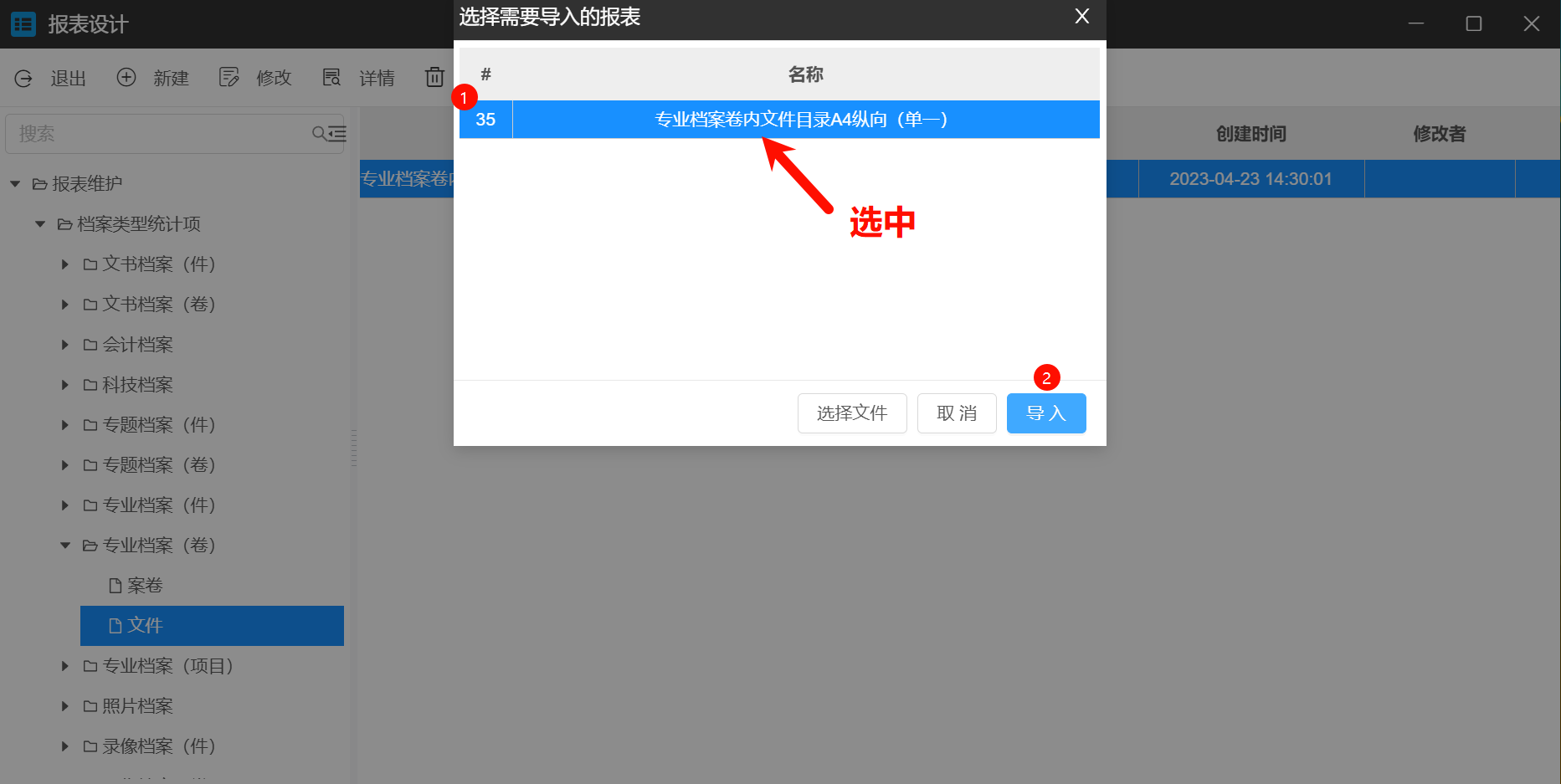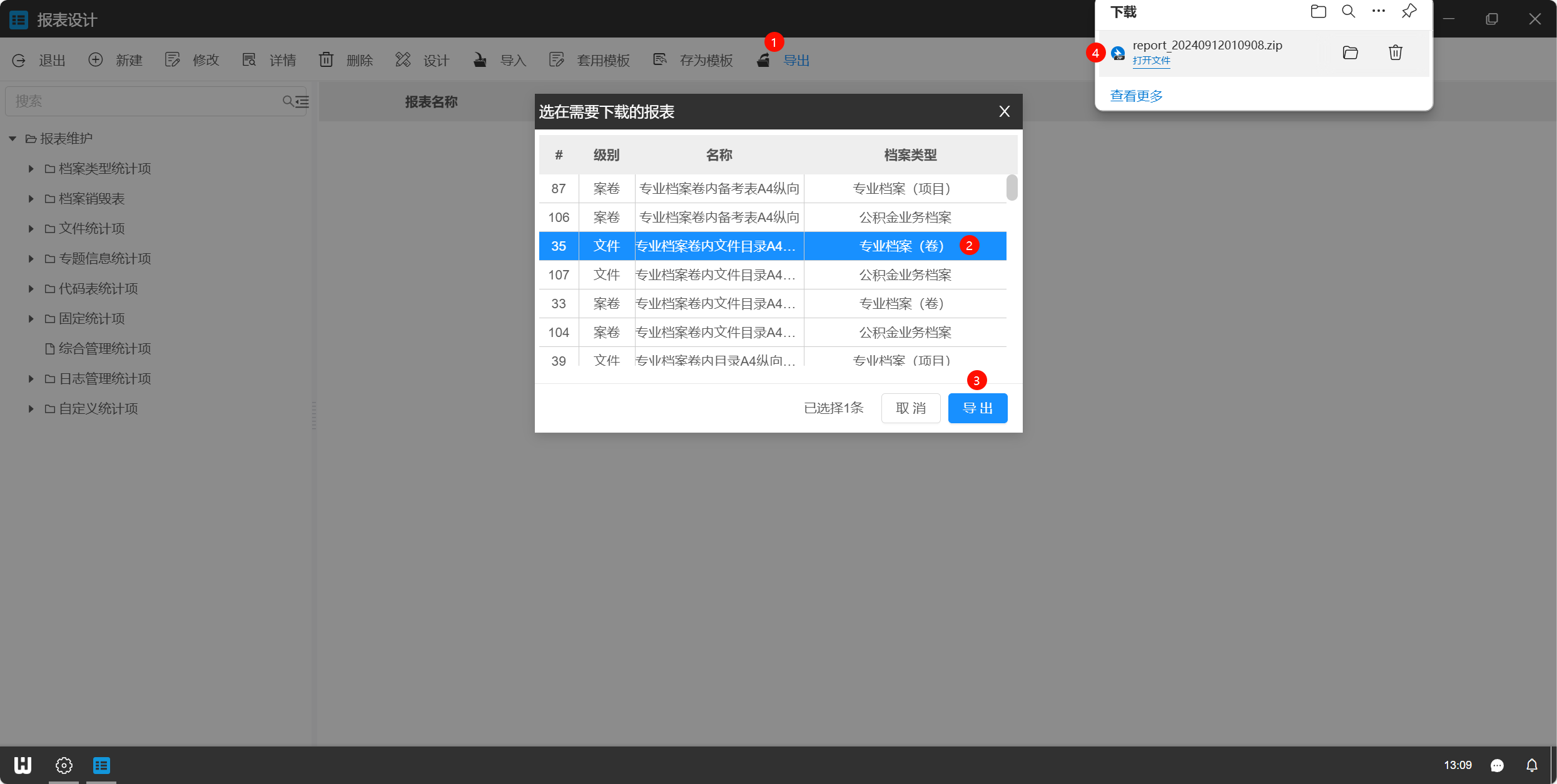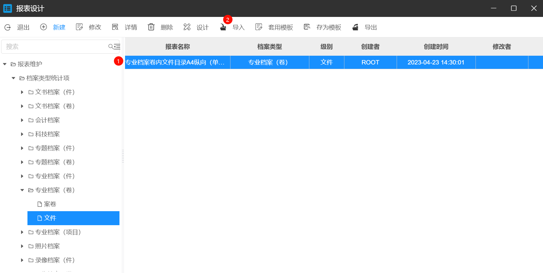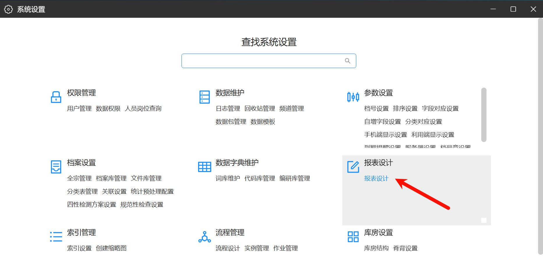 1.登录进入系统后,在系统桌面空白处右键,点击“==系统设置==”。如下图所示:  2.找到“==报表设计==”下的“==报表设计==”,单击打开。如下图所示:  3.==报表导出==。打开==报表设计==模块后,点击右上角“==导出==”,选中(可使用Ctrl或Shift键配合鼠标进行点选或多选)任意一条或多条报表模板,点击“确定”,浏览器右上角自动弹出下载窗口(==注意:不同浏览器的下载窗口有所不同,一般为右上角、中间或左下角==),点击“==保留==”,即可导出报表模板(文件后缀为==zip==)。如下图所示:  4.==报表导入==。展开需要导入报表的档案类型,点击左上角“==新建==”,在弹出窗口中输入“==报表名称==”,选择“==报表器==”(默认即可),点击“==确认==”,选中新建的报表,点击上方“==导入==”,在弹出窗口中浏览待导入的报表模板(文件后缀为==zip==,注意:==仅相同档案类型和相同层级的报表模板可以通用==!),单击“上传”,选中压缩包中的报表,点击“确定”即可导入到新建的报表模板。如下图所示:     [>>>更多报表设计,请参考详细教程](https://m.w3cschool.cn/ureport2/) > 操作过程中有任何问题,请与技术人员联系(服务热线:[15002785136](tel:15002785136 "15002785136"))。