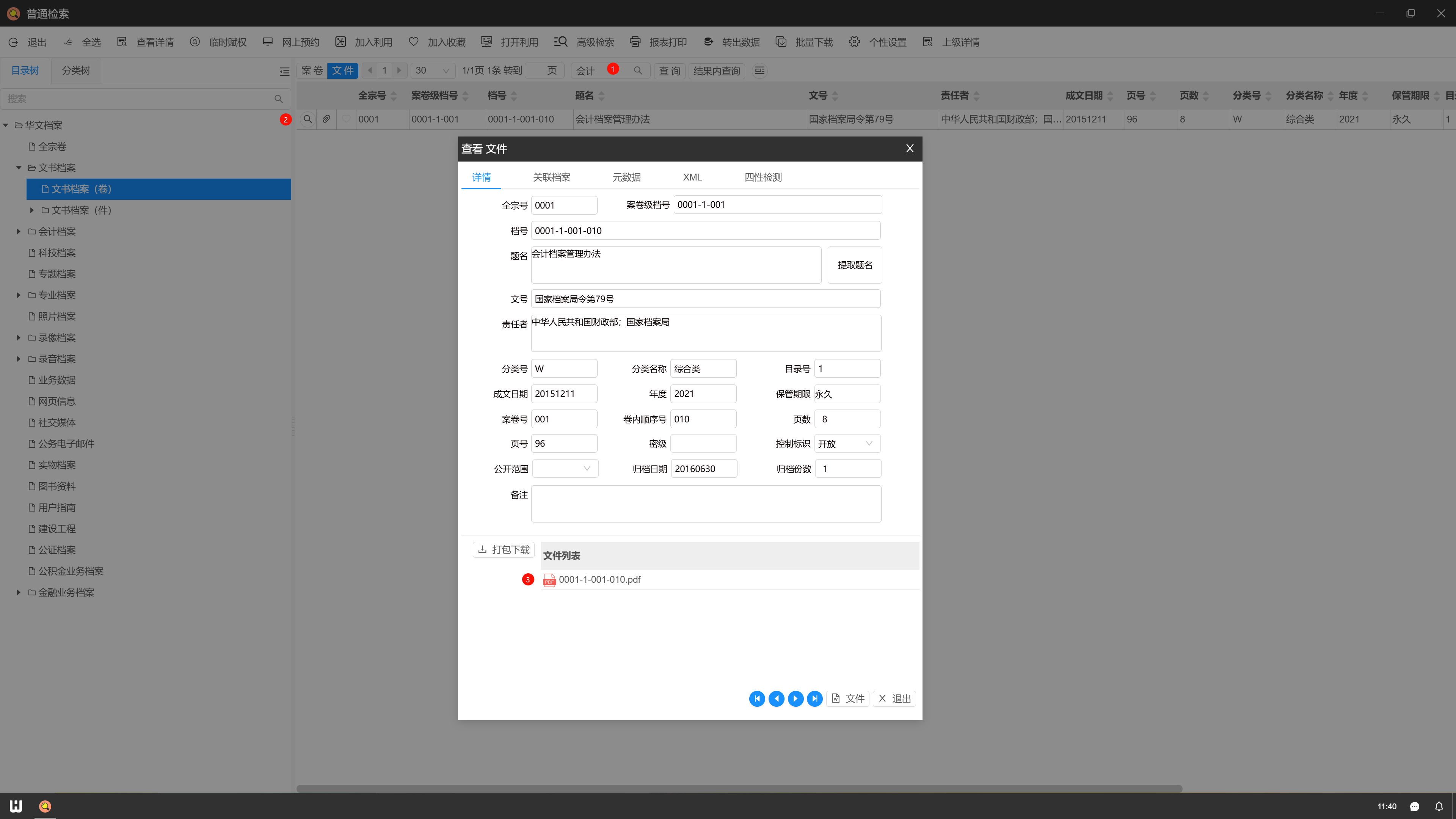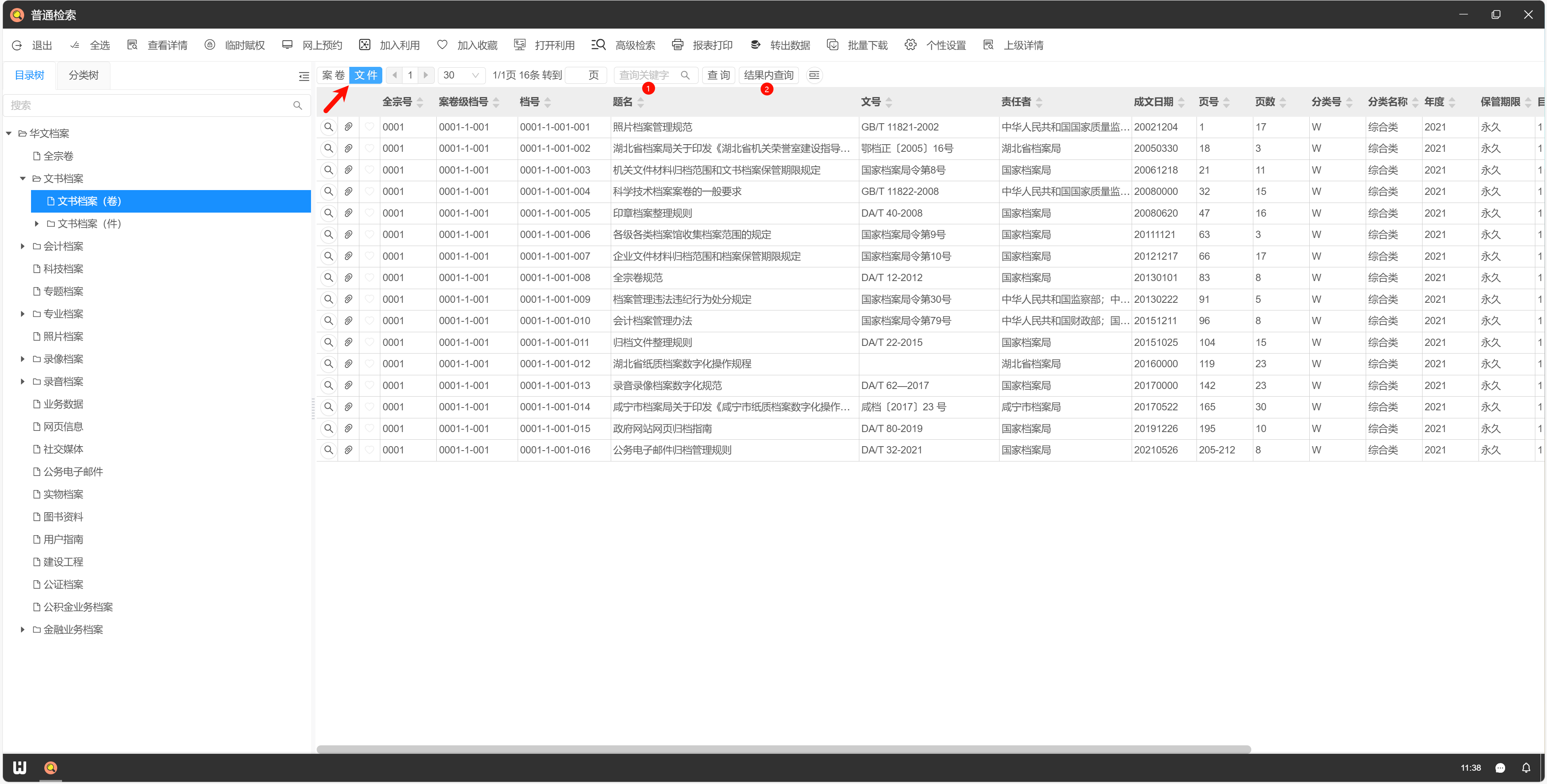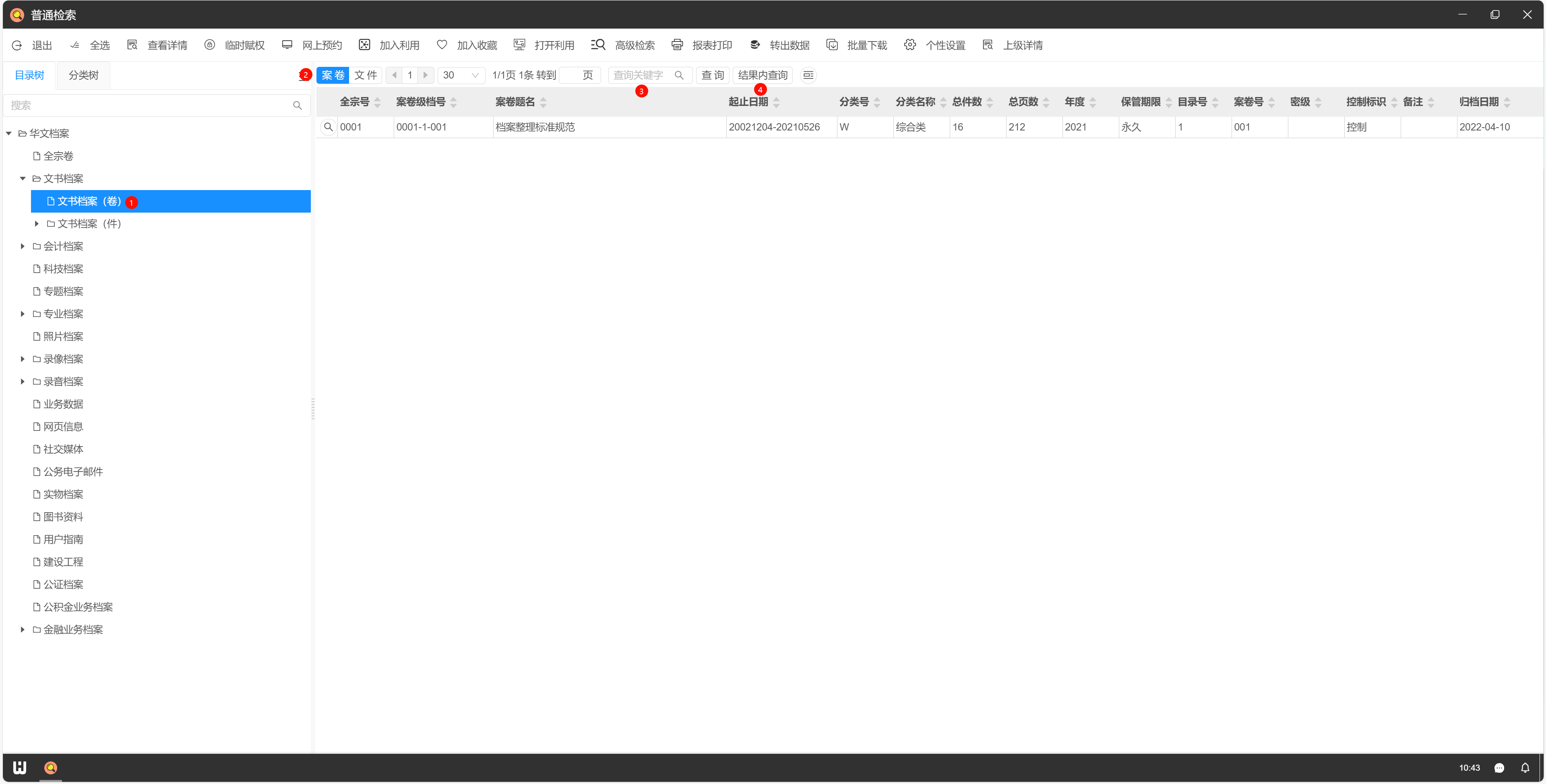 1.登录进入系统后,点击系统桌面“==普通检索==”图标。如下图所示:  2.以“文书档案(卷)”为例,展开左侧目录树,点击“==案卷==”,在搜索框中输入关键词,回车。若需增加条件继续查询,可清空搜索框,输入其他关键词,点击“==在结果内查询==”,依此类推。如下图所示:  3.查询卷内文件时,点击“==文件==”,搜索方法与第二步相同。如下如图所示:  4.检索到需要的结果后,点击目录前方==放大镜==图标,“==查看详情==”,双击附件即可预览、打印、下载。如下图所示:   > 操作过程中有任何问题,请与技术人员联系(服务热线:[15002785136](tel:15002785136 "15002785136"))。