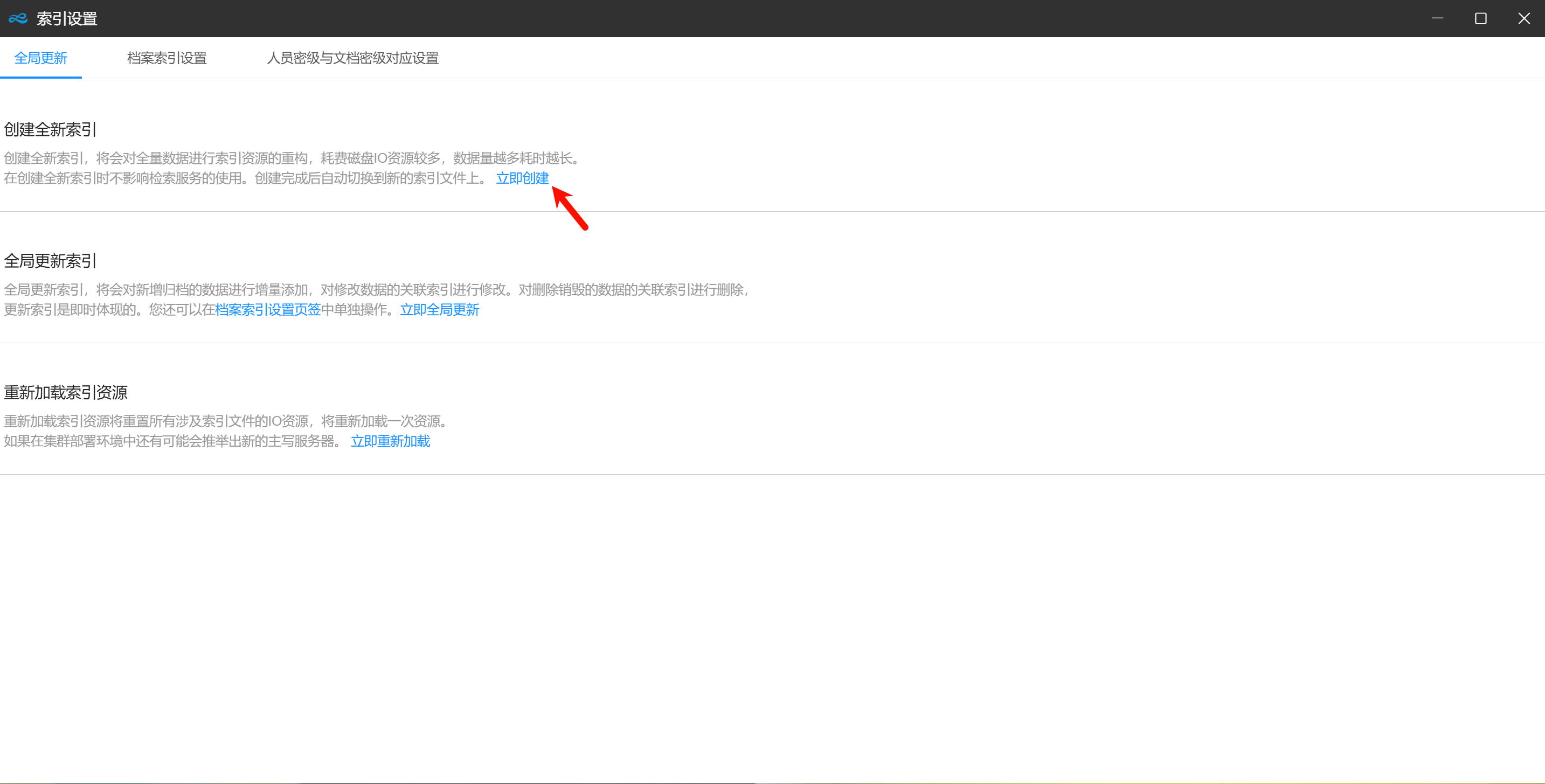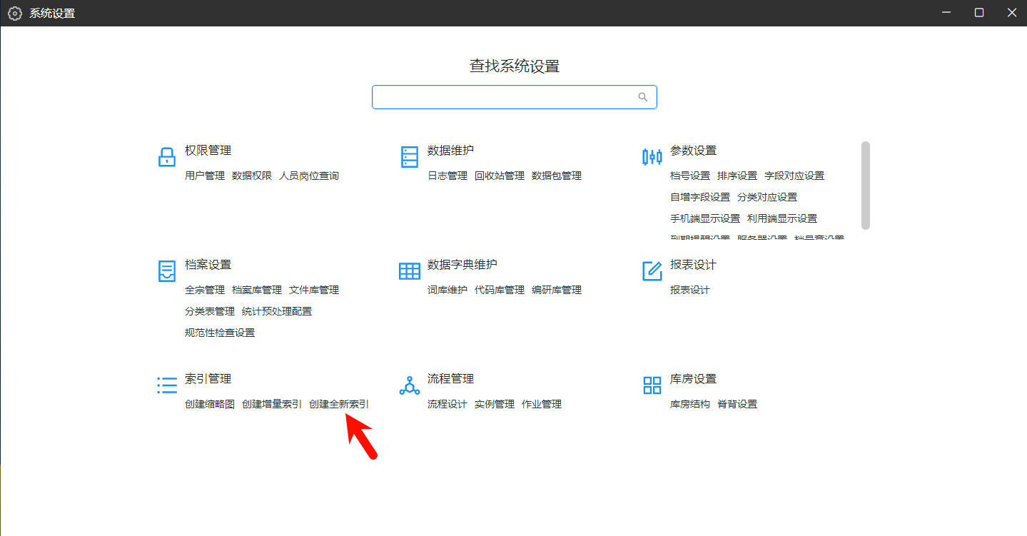1.开启“==全文检索==”(默认会定时对文件进行索引,以下为手动创建索引方法)。登录进入系统后,==单机版==在浏览器地址栏输入:http://localhost:9637/Lams/triggerExtractTxt ,==网络版==在浏览器地址栏输入(非服务器访问请将127.0.0.1改为实际IP地址):http://127.0.0.1:8848/Lams/triggerExtractTxt ,==回车==,等待返回结果(== extract txt success! ==)。如下图所示:  2.按“F5”键刷新网页,在系统桌面空白处右键,点击“==系统设置==”。如下图所示:  3.找到“==索引管理==”下的“==索引设置==”,单击打开。如下图所示: ==单机版==  ==网络版==  4.找到“创建全新索引”,点击“==立即创建==”,稍等片刻即可。如下图所示:  > 操作过程中有任何问题,请与技术人员联系(服务热线:[15002785136](tel:15002785136 "15002785136"))。