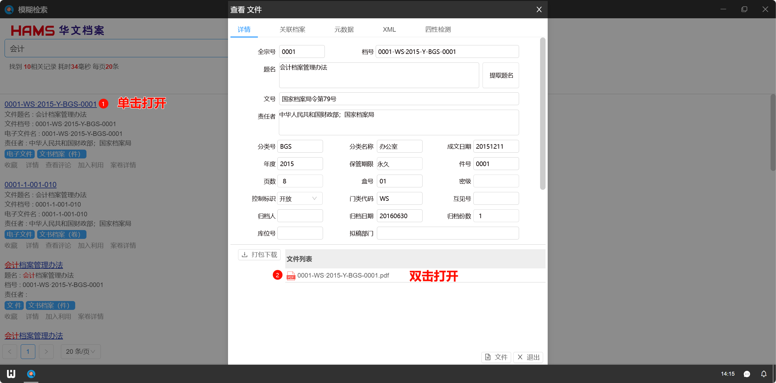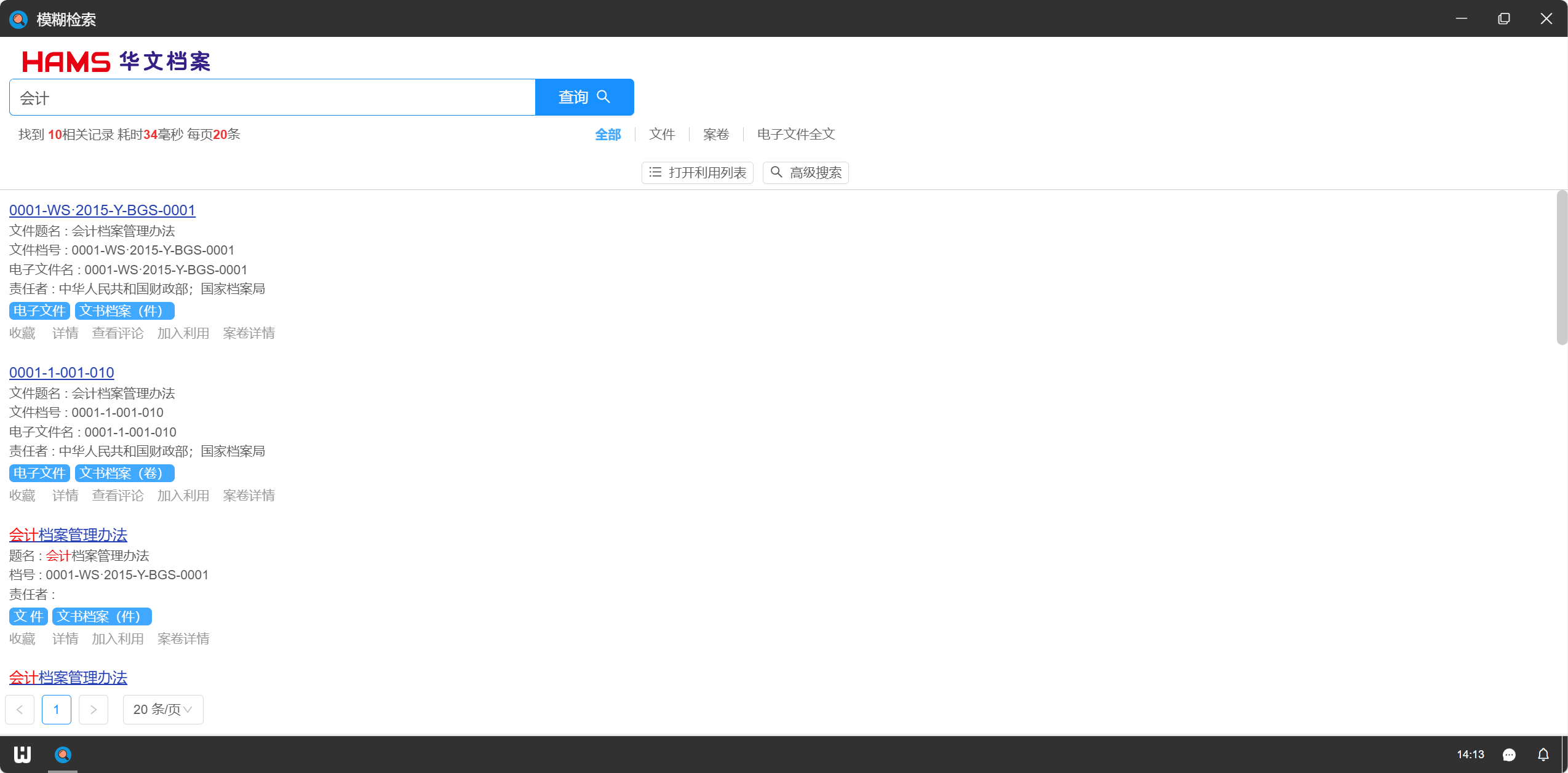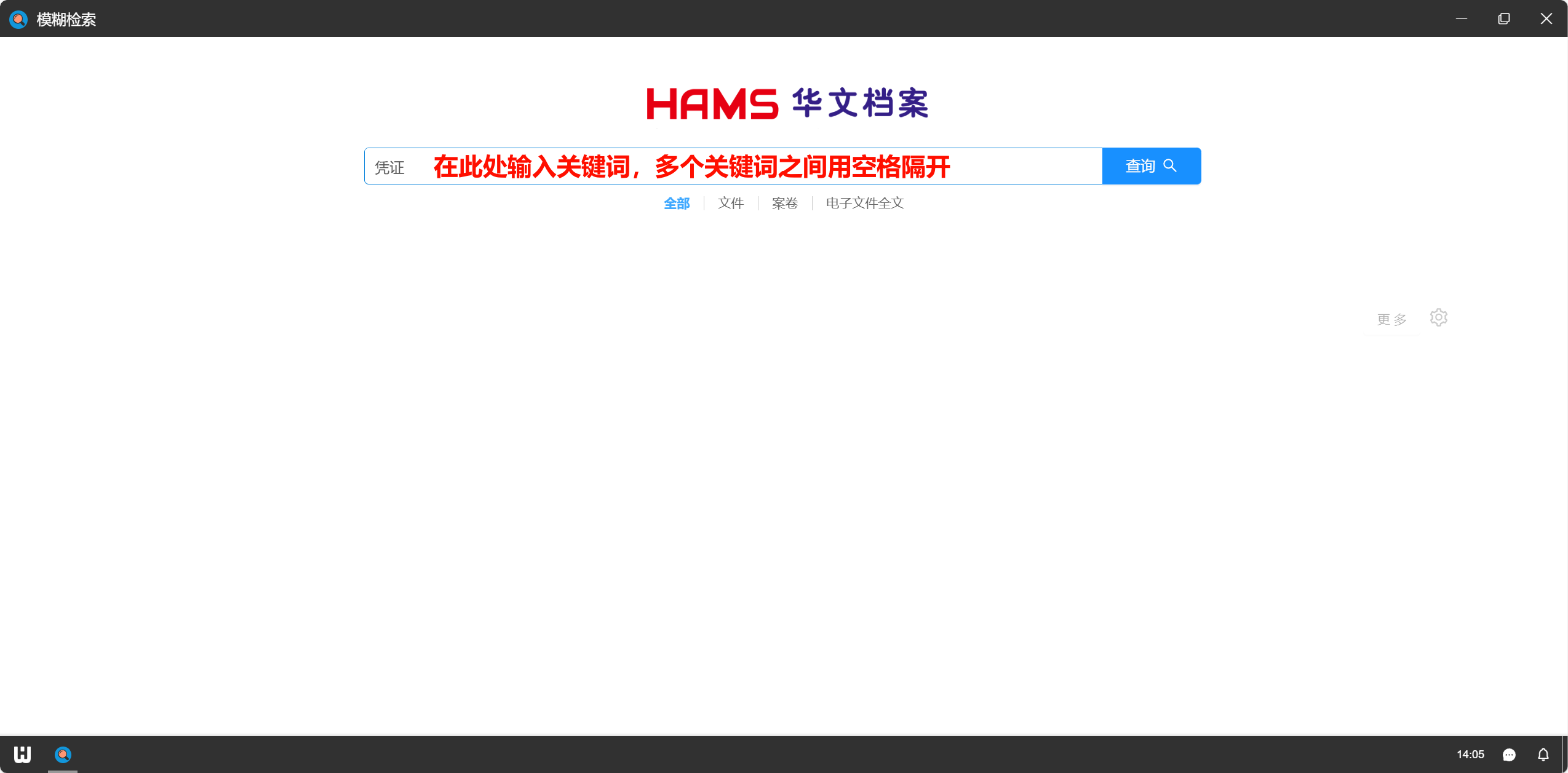 1.登录进入系统后,点击系统桌面“==模糊检索==”图标(首次使用“模糊检索”,如果搜索不到任何结果,请先==创建/更新索引库==,操作方法详见 [HAMS索引库管理](http://xysh.eu.org:10086/doc/463/ "HAMS索引库管理"))。如下图所示:  2.在打开的搜索框中输入关键词,多个关键词之间用空格隔开,回车或者单击“查询”。默认检索范围为“==全部==”,包括==案卷目录==、==文件目录==和==电子文件全文==(即扫描图像中的文字内容,此功能需上传==双层PDF==或==图片==)。如下图所示:  3.检索结果以==带下划线的蓝色字体==展示于顶部,案卷目录或文件目录中包含的关键词以==红色==字体标识,电子文件全文中包含关键词显示为“==档号==”。如下图所示:  4.检验全文检索结果。打开任意一条检索结果为“档号”的记录。如下图所示:  5.单击右上角==放大镜==图标,输入关键词,回车,会自动跳转到关键词出现的页面,并将关键词高亮显示。如下图所示:  6.右上角常用功能按钮从左至右依次为“==下载TXT文本==”、“==打印==”、“==下载==”。如下图所示:  > 操作过程中有任何问题,请与技术人员联系(服务热线:[15002785136](tel:15002785136 "15002785136"))。